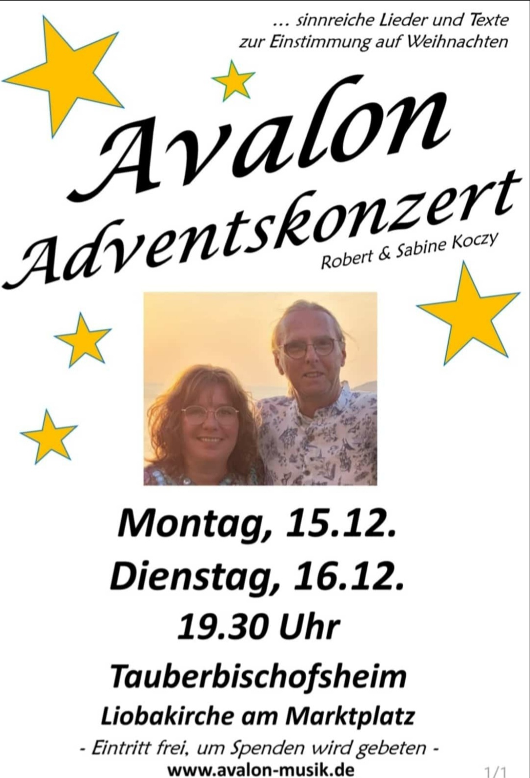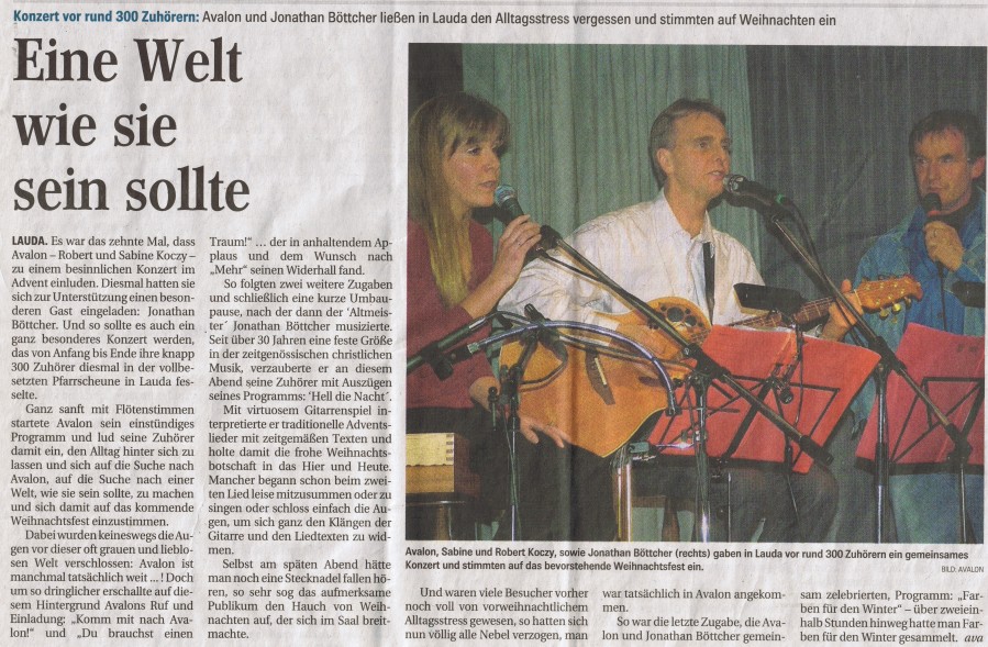 Mittwoch, 16. Dezember 2009, 19.30h: Avalon-Konzert in der Marienkirche in Lauda. Schon eine knappe Stunde vor Beginn kommen die ersten; bereits eine Viertelstunde vor Konzertbeginn ist die Kirche dann bis auf den letzten Platz besetzt. Selbst auf der Empore drängen sich die Leute. Wer jetzt noch kommt, muss stehen oder setzt sich einfach rücklings auf die noch freien Kniebänke. – Kein Rockkonzert, keine Stargala! Es ist `Avalon´, es sind Robert und Sabine Koczy, die zu ihrem alljährlichen Adventskonzert geladen haben – heuer bereits im zehnten Jahr. Alljährlich werden es mehr, die in die kleine, beschauliche Marienkirche pilgern, in der Hoffnung, ja, die meisten inzwischen im Vertrauen, hier einen Ruhepol in ihrem vorweihnachtlichen Streben und Hetzen zu finden. Und dabei sind es doch nur einige Flöten, ein Glockenspiel, Gitarrenklänge und ihre Stimmen, die das Künstlerehepaar aus Lauda mitgebracht hat. Mit ihnen erzählen sie ihre Geschichten. Es sind Lieder, nicht solche, die eine heile Welt vorgaukeln, in das `Friede-Freude-Eierkuchen´- Gesäusel der Vorweihnachtszeit einstimmen. Es sind Lieder, die vom Leben erzählen, in dem beiweiten nicht alles so ist, wie man es sich wünscht, die es ernst nehmen in all seiner Unvollkommenheit. Aber es sind auch Lieder, die nicht in der Hoffnungslosigkeit stehen bleiben; Lieder, die an der Sehnsucht anknüpfen, dass es doch anders sein sollte und auch anders sein kann, wenn man seinen Träumen traut. „Du brauchst einen Traum, für den Du lebst ...“ und „... was an Liebe man hat gegeben, das bleibt von unserem Leben“– singen sie ihren Zuhörern zu. Und wie zur Bestätigung, hüpft die kleine Miriam, die 4jährige Tochter des Künstlerehepaares, die eigentlich schon schlafen sollte, vom Schoß ihrer Oma und drängt auf Mamas Schoß und ans Mikrofon. Als sie den Refrain mit kindlicher Begeisterung mitsingt, hat manch einer Tränen in den Augen und auch der letzte spürt: „Hier ist Avalon“, hier ist Leben, so, wie es sein sollte.